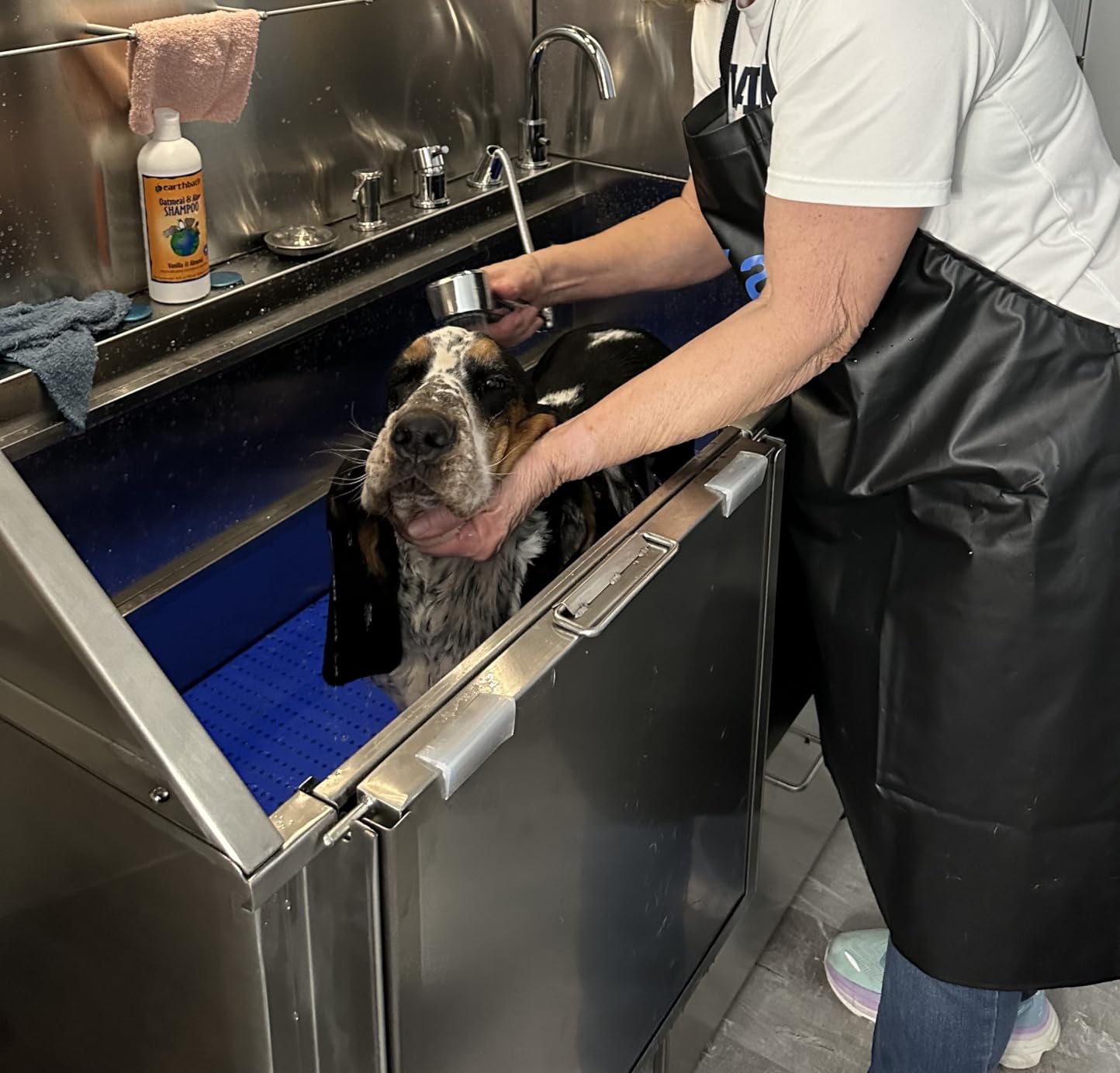 Iāve used the bath twice now and love it. The assembly of the bath was fairly easy. Itās very sturdy and beautiful. All of the controls work great. I was concerned that the spray nozzle wouldnāt have enough pressure, but it does. I like the non-slip shelves that offer different levels for the dog to stand on and the water to drain through. My puppy (almost 6 month old golden retriever) is reluctant to get her back paws on the ramp so I boost her in. Sheās very happy in there. I was thankful they included a suction licky mat and an apron with purchase. Much needed items that I didnāt know I needed!